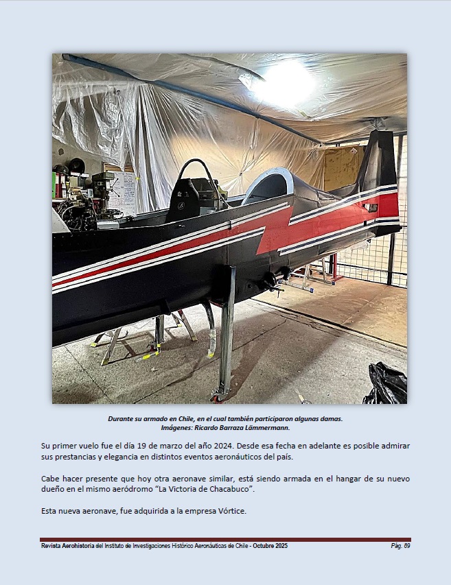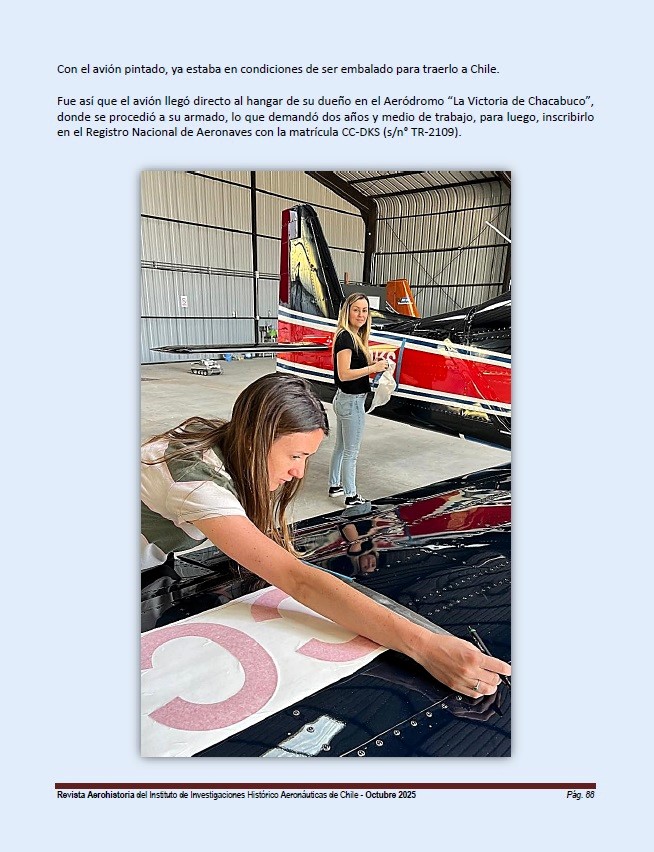The aircraft arrived directly at its owner’s hangar at the “La Victoria de Chacabuco” Aerodrome, where assembly took place, which took two and a half years, before registering it in the National Aircraft Registry with the registration CC-DKS (s/n° TR-2109).